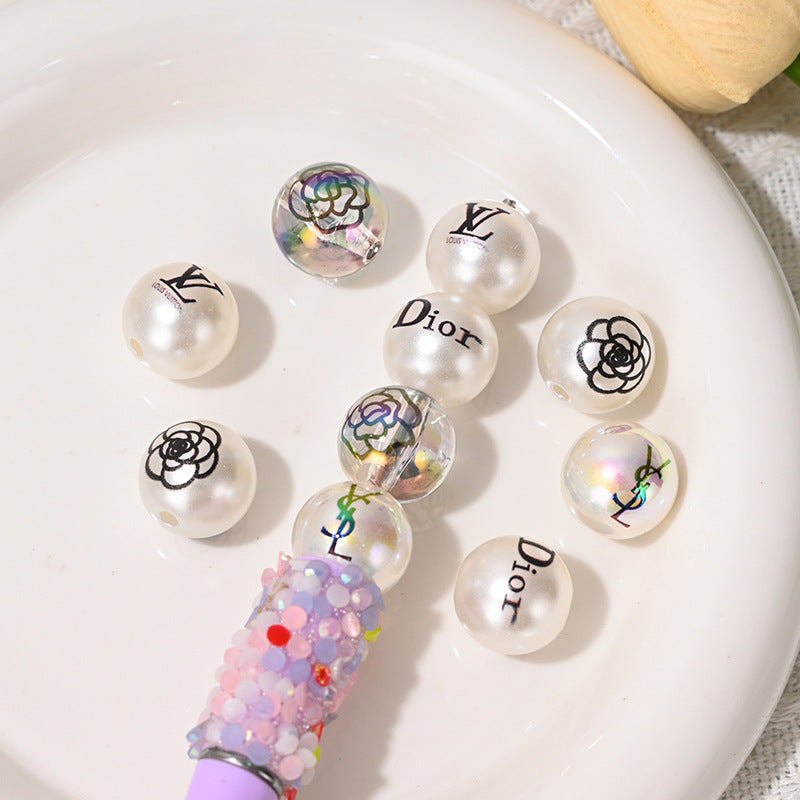 16mm Designer Printed Round Bead Floral Imitation Pearl Straight Hole Beads for DIY Phone Chain Accessories